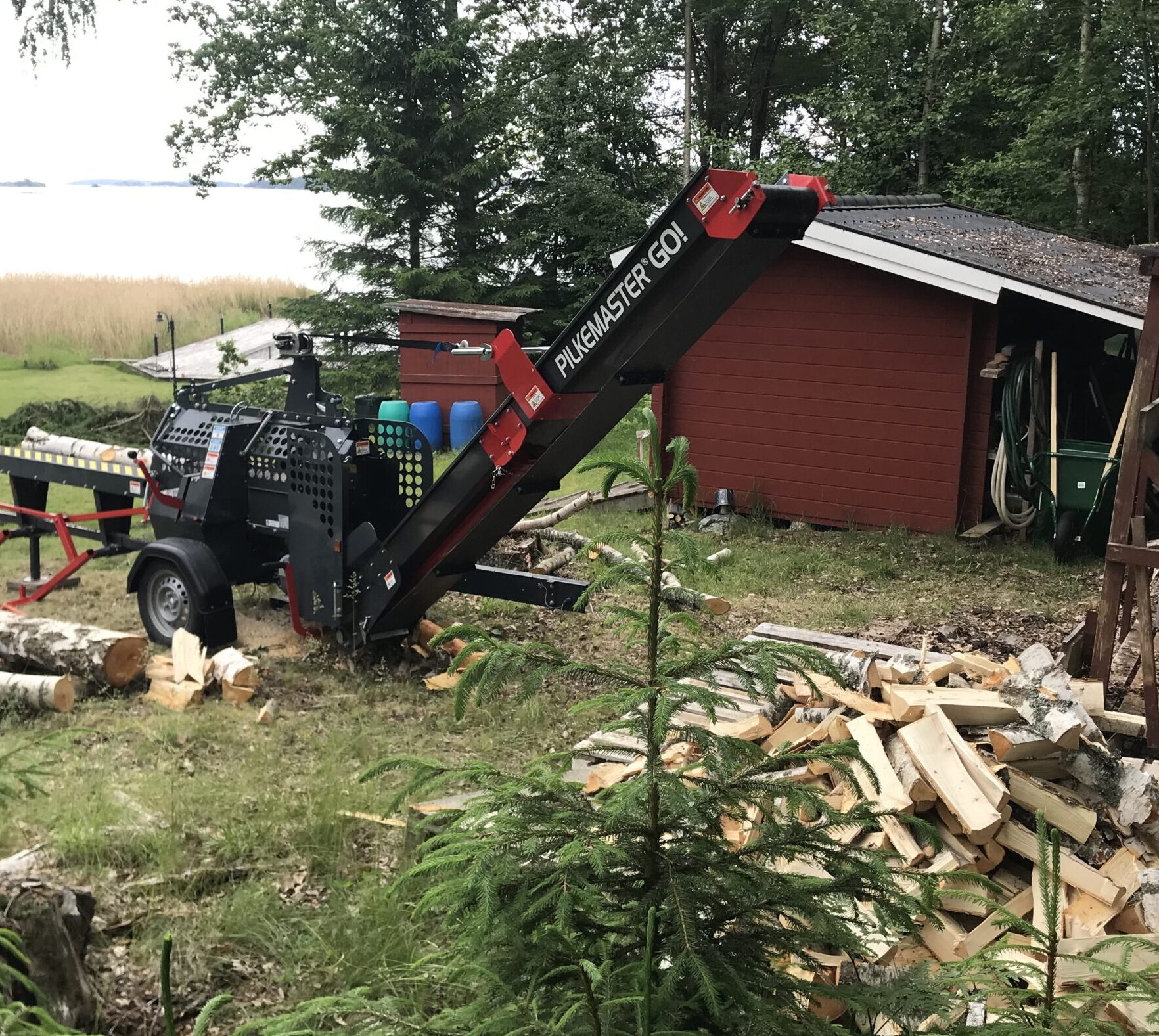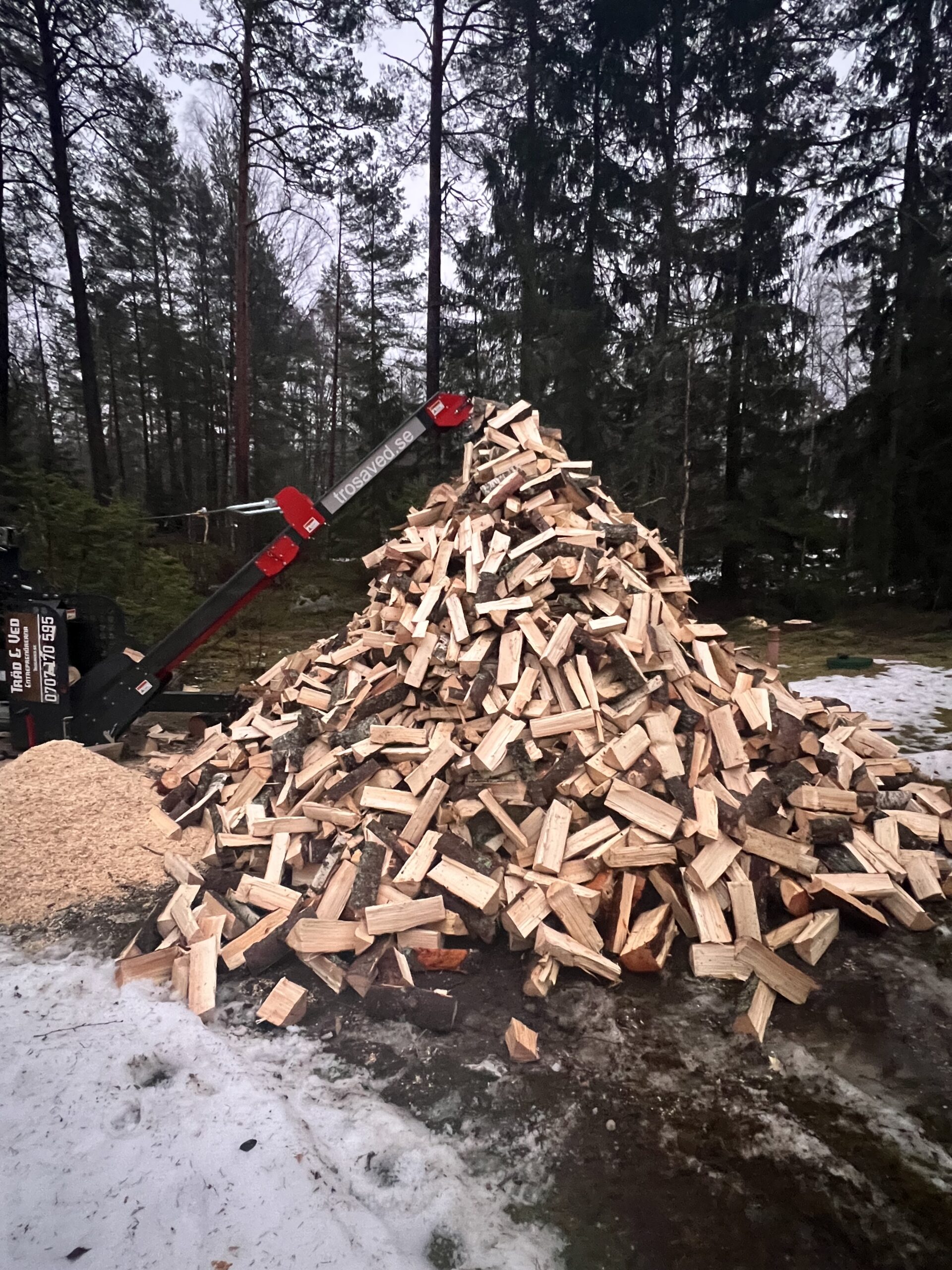 När trädfällningen är klar, kapar och klyver vi träden med vår mobila vedprocessor (<30 cm i diameter). Med lite planering brukar det bli runt två-tre kubikmeter ved per timme, ibland direkt in i vedförrådet.