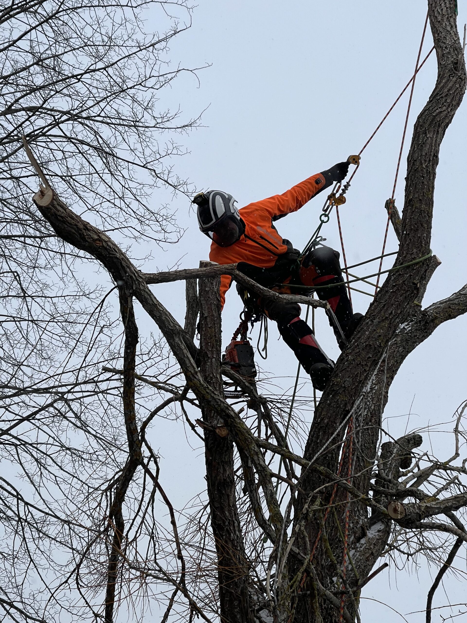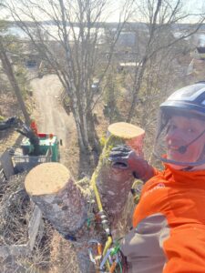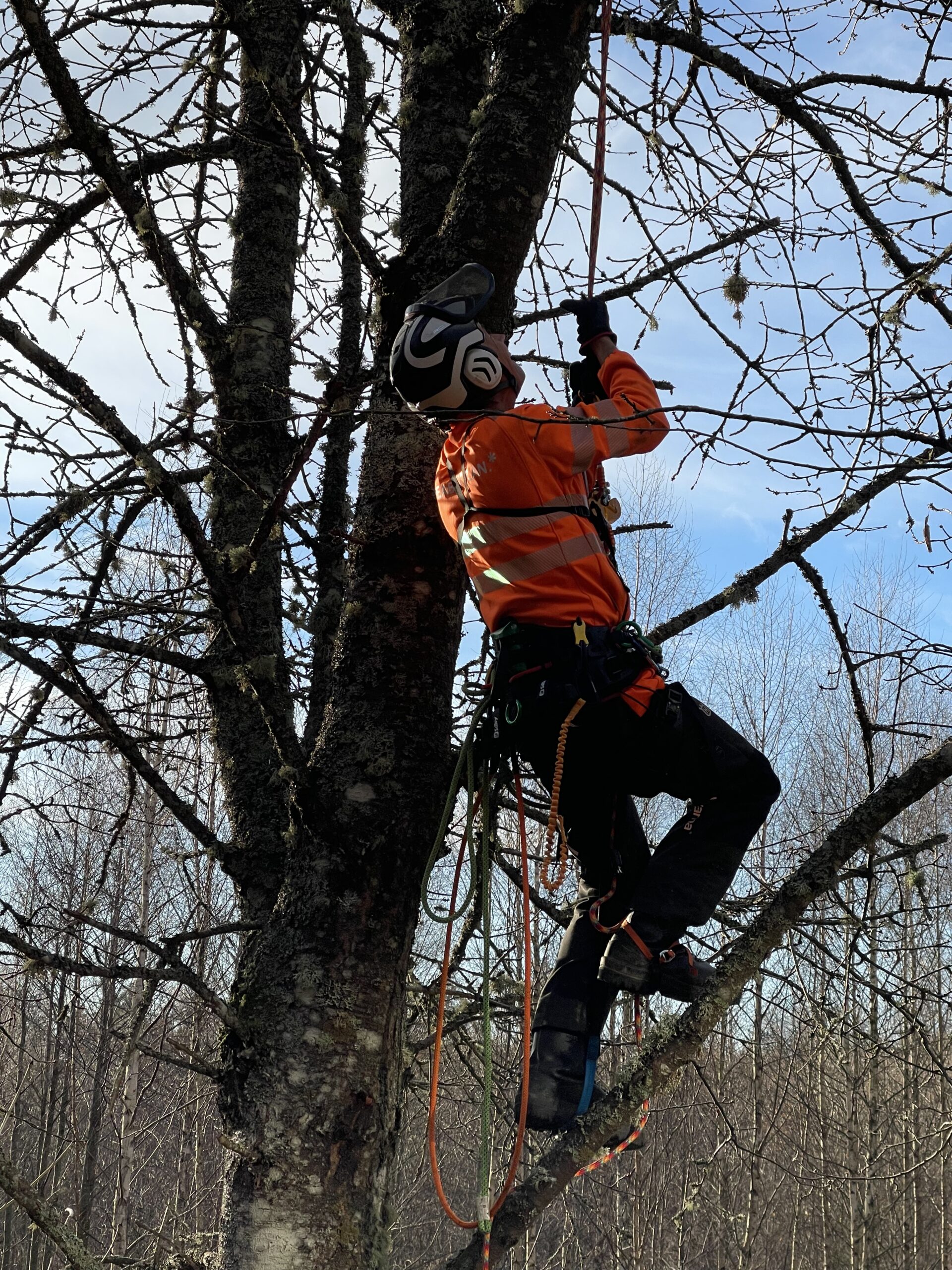 Träd & Ved Entreprenörerna är utbildade, certifierade och tränade för att klättra i och sektionsfälla träd med motorsåg samt utföra räddningsinsatser.