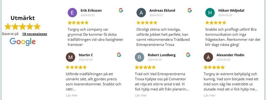 Våra kunder brukar säga att vi är snabba, proffsiga och att de känner trygghet i att anlita oss för trädfällning, trädvård och vedhantering